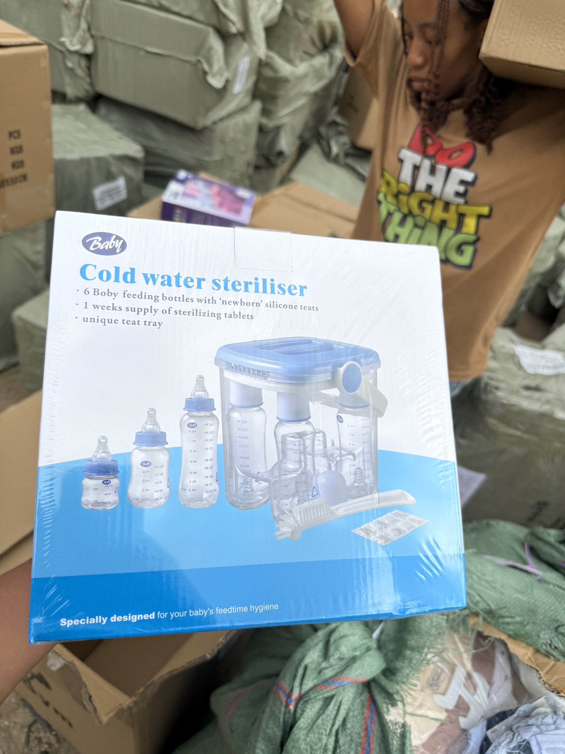 Cold Water Sterilizer – A safe and convenient way to keep your baby’s bottles and feeding accessories germ-free. Simply add sterilizing tablets or liquid to cold water, submerge items, and they stay sterile for up to 24 hours. Perfect for home or travel, with no need for heat or electricity.